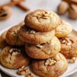A white plate holds a stack of round cookies, each cookie is golden brown with a cracked surface and topped with small walnut pieces scattered unevenly on top. The cookies have a slightly rough texture with a dusting of cinnamon sugar that gives them a warm, speckled look. The plate rests on a white marbled surface, with a couple of cinnamon sticks and walnut halves blurred gently in the background, adding a cozy fall feel to the image. photo taken with an iphone --ar 4:5 --v 7