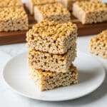 These thick and chewy Biscoff Rice Krispie Treats are a delightful twist on the classic snack, incorporating creamy Biscoff cookie butter for a rich, spiced flavor. Made with simple ingredients like butter, marshmallows, crispy rice cereal, and Biscoff spread, these treats are easy to prepare and perfect for nut-free snacking.