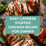 Keywords: Caprese stuff chicken, stuffed chicken breast recipe, Italian stuffed chicken, baked stuffed chicken, Caprese chicken with basil, mozzarella and tomato, healthy chicken recipe