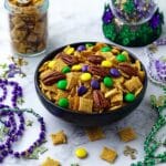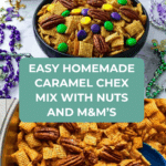 Caramel Chex Mix is a deliciously sweet and crunchy snack mix combining crispy Corn Chex cereal, toasted pecans and almonds, all coated in a rich homemade caramel glaze. Finished with festive red and green M&M’s for a perfect holiday treat or anytime indulgence.