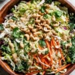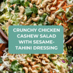 This Chicken Cashew Crunch Salad is a vibrant, flavorful dish featuring shredded rotisserie chicken, crunchy cashews, and fresh Napa cabbage tossed in a creamy sesame-teriyaki tahini dressing. Quick to prepare and packed with textures and savory-sweet Asian-inspired flavors, it’s perfect for a healthy lunch or light dinner.