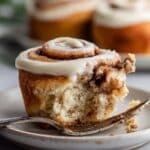 A close-up image of a cinnamon roll with three visible layers: the bottom layer is a golden-brown, slightly crispy crust, the middle layer is soft and light beige dough with a swirl of dark cinnamon filling, and the top layer is a thick swirl of creamy white frosting partially covering the cinnamon swirl. The cinnamon roll sits on a white plate with a slightly uneven edge, placed on a white marbled surface. In the foreground, a silver fork is lifting a bite of the cinnamon roll, showing the soft inside texture and cinnamon filling, with a blurred background of more cinnamon rolls. Photo taken with an iphone --ar 4:5 --v 7