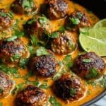 These Coconut Curry Meatballs combine tender ground chicken or turkey meatballs with a rich and flavorful coconut curry sauce. Baked to perfection and simmered in a fragrant blend of red curry paste, coconut milk, and aromatic spices, this dish offers a comforting fusion of savory and spicy flavors, garnished with fresh cilantro and lime wedges for a bright finish. Perfect served over jasmine rice or noodles for a satisfying meal.