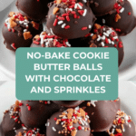 Delicious no-bake Cookie Butter Balls coated in smooth semi-sweet chocolate and decorated with festive sprinkles. This easy-to-make treat combines creamy cookie butter, powdered sugar, and butter to form a sweet dough, chilled and dipped in melted chocolate. Perfect for holiday gatherings or anytime you need a quick, indulgent dessert.