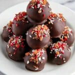 Delicious no-bake Cookie Butter Balls coated in smooth semi-sweet chocolate and decorated with festive sprinkles. This easy-to-make treat combines creamy cookie butter, powdered sugar, and butter to form a sweet dough, chilled and dipped in melted chocolate. Perfect for holiday gatherings or anytime you need a quick, indulgent dessert.