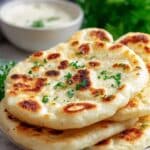 The image shows three pieces of flatbread stacked on a white plate, each flatbread with a golden-brown toasted surface and a soft, white inside texture. Small browned spots cover the top side, giving it a slightly crispy look. Fresh green parsley leaves are scattered over the top flatbread for color contrast. In the blurred background, a white bowl filled with a creamy white sauce is visible, and there are green plants adding a touch of natural green to the scene. The surface under the plate is a white marble texture. Photo taken with an iphone --ar 4:5 --v 7