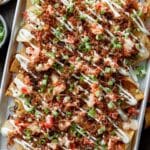 Crab Rangoon Nachos combine crispy homemade wonton chips topped with a creamy, savory cream cheese sauce, chopped imitation crab, sweet chili sauce, garlic chili oil, and garnished with green onions and sesame seeds for a delicious appetizer or snack that’s bursting with flavor and texture.