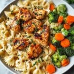 This Creamy Cheddar & Havarti Chicken Bowtie Pasta with Roasted Veggies is a comforting and flavorful meal featuring tender chicken and perfectly cooked bowtie pasta tossed in a rich, creamy cheese sauce made from sharp cheddar and smooth Havarti cheeses. Roasted broccoli and carrots add a vibrant and nutritious touch, while garlic and Italian seasoning provide aromatic depth. An easy-to-follow recipe perfect for weeknight dinners, finished with fresh parsley for a bright and fresh garnish.