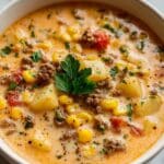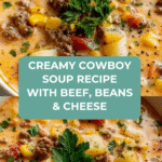 This Creamy Cowboy Soup is a hearty, comforting Southwestern American dish featuring ground beef, potatoes, beans, corn, and tomatoes in a creamy, cheesy broth. Perfect for chilly days or meal prep, it balances bold spices with rich dairy for a satisfying one-pot meal.