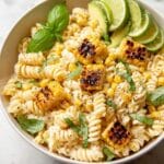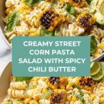Keywords: street corn, pasta salad, creamy pasta, grilled corn, chili butter, cotija cheese, summer salad, spicy pasta salad