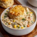 This Crock Pot Chicken recipe is an easy, comforting meal perfect for busy days. Tender chicken simmers in a creamy sauce with mixed vegetables, finished with warm buttermilk biscuits for a satisfying dinner.