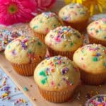 These Funfetti Greek Yogurt Muffins are soft, fluffy, and bursting with colorful rainbow sprinkles. Made with Greek yogurt for added protein and moisture, they offer a fun and slightly healthier treat perfect for breakfast, snacks, or a light dessert. The combination of butter and olive or avocado oil creates a tender crumb, while the gentle folding of sprinkles ensures a vibrant, evenly distributed sprinkle crunch in every bite.