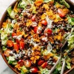 This Easy Taco Salad is a flavorful and fresh dish combining seasoned lean ground beef, crisp romaine lettuce, juicy tomatoes, black beans, charred corn, creamy avocados, and crunchy sunflower seeds, all tossed with a tangy Cilantro Lime Dressing. Perfect for a quick lunch or dinner, it offers a customizable and healthy option that can be made vegetarian or with ground turkey, served with tortilla chips for added crunch.