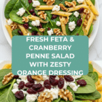 A vibrant and refreshing Mediterranean-inspired penne salad featuring tangy feta, sweet dried cranberries, crunchy toasted walnuts, and fresh baby spinach, all tossed in a bright and zesty orange vinaigrette. Perfect as a light lunch or a flavorful side dish.