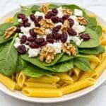 The image shows a close-up of a pasta dish in a white bowl on a white marbled surface. The dish has two main layers: the base layer is golden-yellow cooked penne pasta, with a smooth and slightly glossy texture. On top, there is a layer of fresh, dark green spinach leaves spread evenly. Scattered over the spinach and pasta are small, crumbly, white feta cheese pieces and deep red dried cranberries. A few whole, light brown walnuts add a crunchy texture and contrast. The colors are bright and fresh, making the dish look healthy and delicious. Photo taken with an iphone --ar 4:5 --v 7