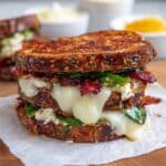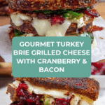 A decadent grilled cheese sandwich featuring creamy brie, savory roast turkey, crispy bacon, fresh avocado, and tangy cranberry sauce, all melted between buttery toasted bread slices for a perfect balance of flavors and textures.