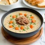 A deep bowl filled with creamy, thick soup that has a light beige color as the base, with chunks of orange carrot and shredded brown meat scattered evenly on top. The surface has small green herb flakes sprinkled for garnish, with some visible black pepper specks. The bowl is dark and placed on a wooden round coaster, all set on a white marbled texture. In the background, there are blurred pieces of bread on another white bowl and a dish with bread slices out of focus, adding a cozy feel. photo taken with an iphone --ar 4:5 --v 7