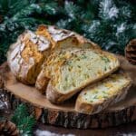 A rustic loaf of bread is cut into three thick slices and placed on a round wooden board with tree bark edges. The bread's crust is golden brown with a cracked texture dusted lightly with flour. The inside is soft and pale yellow with small green herb bits and orange cheese specks spread throughout the light, airy crumb. Surrounding the board, there are green pine branches and pinecones with some light snow-like dusting, creating a natural forest winter scene. The setting has a dark background contrasting the bread's warm tones and natural elements, all resting on a white marbled texture. photo taken with an iphone --ar 4:5 --v 7