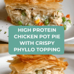 This irresistible high protein chicken pot pie combines tender shredded chicken with a flavorful vegetable filling, all topped with crisp, buttery phyllo dough. It’s a comforting, hearty dish perfect for a satisfying family meal.