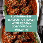 Keywords: Italian pot roast, stracotto, oven-baked polenta, Gorgonzola polenta, braised chuck roast, Italian comfort food, slow-braised beef, red wine pot roast