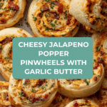 Jalapeno Popper Pinwheels are a delightful appetizer featuring a creamy, cheesy filling with spicy diced jalapenos and crispy bacon all rolled inside flaky puff pastry. These golden-baked pinwheels are brushed with a flavorful garlic butter for a savory finish, perfect for parties or snack time.