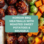 Keywords: Korean BBQ meatballs, roasted vegetables, sweet potatoes, Brussels sprouts, Korean BBQ sauce, homemade meatballs, dinner recipe