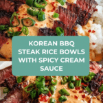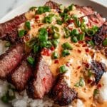 Keywords: Korean BBQ, steak rice bowl, spicy cream sauce, flank steak, grilled steak, jasmine rice, Korean cuisine, Asian dinner recipe