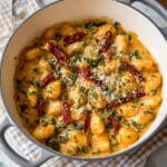 This Marry Me Gnocchi recipe features tender potato gnocchi simmered directly in a creamy sun-dried tomato sauce enriched with garlic, herbs, and Parmesan cheese. Finished with fresh baby spinach and basil, it’s a comforting Italian-inspired one-pan dish that’s quick to make and packed with rich flavor.