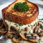 This Melt Sandwich features deeply caramelized onions and savory sautéed cremini mushrooms layered with melted Swiss cheese on toasted sourdough bread. Rich in flavor and texture, it’s a perfect comforting vegetarian sandwich ideal for lunch or a cozy dinner.