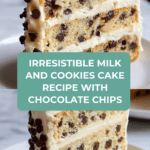 Milk and Cookies Cake is a nostalgic, indulgent dessert featuring moist chocolate chip vanilla cake layers paired with rich chocolate chip frosting and fluffy vanilla frosting, crowned with chocolate chip cookies for the ultimate comforting sweet treat.