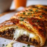 This mouthwatering Mozzarella Cheese Steak Stromboli features a crispy golden crust stuffed with tender ribeye steak, caramelized onions, bell peppers, and a blend of mozzarella and Parmesan cheeses. Perfectly seasoned and baked to perfection, this stromboli makes for a hearty and delicious meal that’s ideal for sharing.