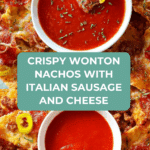 These Nachos Copycat feature a creative twist with crispy wonton wrapper chips topped with spicy Italian pork sausage, pepperoni, and a blend of melted mozzarella and pepper jack cheeses. Perfectly baked and served with marinara sauce, this recipe offers a flavorful and crunchy spin on classic nachos that’s quick and easy to make.