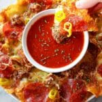 These Nachos Copycat feature a creative twist with crispy wonton wrapper chips topped with spicy Italian pork sausage, pepperoni, and a blend of melted mozzarella and pepper jack cheeses. Perfectly baked and served with marinara sauce, this recipe offers a flavorful and crunchy spin on classic nachos that’s quick and easy to make.