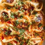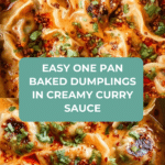 Keywords: baked dumplings, viral dumplings, one pan dinner, red curry sauce, coconut curry dumplings, easy weeknight meal, frozen dumplings recipe, Thai inspired dinner