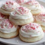 The image shows a plate of soft cookies with white frosting swirled on top in a thick layer, each cookie topped with small crushed red and white peppermint pieces. The cookies are light golden and look soft and fluffy, arranged closely on a white plate. The background is a white marbled texture. photo taken with an iphone --ar 4:5 --v 7