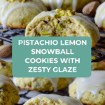 These Pistachio Lemon Snowball Cookies are tender, nutty, and beautifully glazed with a zesty lemon icing. Featuring finely ground roasted pistachios and a unique touch of instant pistachio pudding mix, these cookies offer a delicate crumb and refreshing citrus flavor, perfect for any occasion.