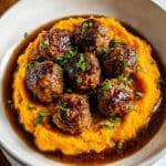 These succulent pork meatballs are perfectly seasoned with smoked paprika, sage, and Worcestershire sauce, then pan-seared to a golden brown. Served with creamy spiced sweet potato mash and a rich bourbon-maple glaze, this comforting dish combines savory and sweet flavors for a hearty, satisfying meal.