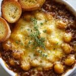 This Simple Baked French Onion Gnocchi recipe combines deeply caramelized sweet onions with tender gnocchi simmered in a savory broth and white wine sauce, baked to perfection with melted Gruyere cheese on top. Served alongside crispy French bread slices, it’s a comforting and flavorful dish perfect for a quick dinner or cozy meal.