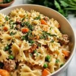 This Simple Ground Turkey Pot Pie Pasta combines the comforting flavors of a classic pot pie with the ease of a one-pan pasta dish. Ground turkey is browned with aromatic vegetables and Italian seasoning before being simmered together with farfalle pasta, chicken broth, and milk to create a creamy, hearty meal. Peas add a pop of color and sweetness, finishing this dish with a nutritious and satisfying touch.
