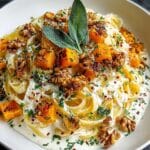 A comforting and creamy sage pasta featuring roasted butternut squash, sautéed aromatics, and a luscious Parmesan sauce. This recipe blends warm flavors of fresh sage and garlic, finished with crunchy toasted walnuts for added texture. Perfect for a cozy weeknight dinner or a special vegetarian meal.