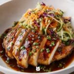 Sticky Apple Cider Chicken with Crisp Autumn Slaw is a delicious American main course featuring tender sautéed chicken breasts glazed with a syrupy apple cider reduction. Accompanied by a fresh, tangy slaw made from shredded cabbage, carrots, apple cider vinegar, and honey, this dish perfectly balances sweet and savory flavors, making it an ideal seasonal meal for fall.