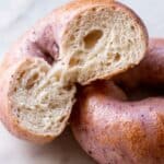 - Poach Bagels: Carefully lower the bagels, one or two at a time, into the boiling water and poach for 1 minute on each side. Remove them using a slotted spoon or spatula and place on a wire rack to drain.