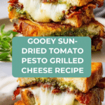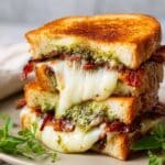 A deliciously gooey Sun-Dried Tomato Pesto Grilled Cheese sandwich made with layers of provolone and fresh mozzarella cheeses, spread with savory sun-dried tomato pesto, and grilled to golden perfection. This easy-to-make comfort food twist combines the rich flavors of Italian pesto with crispy, buttery sourdough bread for the perfect indulgent lunch or snack.