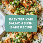 Teriyaki Salmon Sushi Bake is a delicious, comforting dish that combines tender salmon with flavorful teriyaki sauce over a bed of sushi rice. Topped with creamy avocado, spicy mayo, and crunchy garnishes, it’s a crowd-pleaser perfect for easy weeknight dinners or entertaining guests.