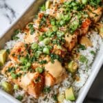 This Teriyaki Salmon Sushi Bake is a delicious and easy-to-make layered dish featuring tender salmon marinated in savory teriyaki sauce, baked over a base of sticky sushi rice, and topped with creamy avocado, spicy mayo, furikake, crispy fried onions, and fresh scallions. It’s a perfect fusion of sushi flavors in a comforting baked casserole style that’s ready in under 30 minutes.