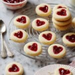 Keywords: thumbprint cookies, heart cookies, Valentine’s Day cookies, jam-filled cookies, easy cookie recipe