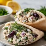 Two pita halves filled with a creamy chicken salad sit on a white plate placed on a white marbled surface. Each pita is light brown and soft with slightly rough textures on the outside and is overstuffed with a chunky filling made of white shredded chicken mixed with green herbs, small pieces of red onion, and dark purple olives. Sprigs of fresh dill and chopped green parsley peek out on top of the filling, adding a touch of green. In the blurry background, a halved lemon and a small white bowl with chopped herbs can be seen. photo taken with an iphone --ar 4:5 --v 7