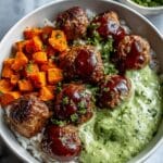 - Assemble Bowls: Start with a bed of cooked quinoa in each serving bowl. Layer with roasted sweet potatoes, roasted broccoli, and barbecue-coated meatballs. Drizzle generously with the avocado goddess sauce and garnish with extra herbs or a squeeze of lime if desired.