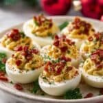 Keywords: deviled eggs, jalapeño cheddar eggs, holiday appetizer, Christmas deviled eggs, bacon deviled eggs, cheese stuffed eggs, jalapeño recipes