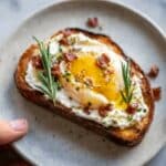 A single slice of toasted brown bread topped with a layer of white creamy spread, followed by a perfectly cooked sunny-side-up egg with a bright yellow yolk slightly dripping. Small bits of crispy brown bacon are sprinkled on top, and a few green herb sprigs decorate the dish. The toast is placed on a white plate set on a white marbled surface. A woman's hand is holding the edge of the plate. Photo taken with an iphone --ar 4:5 --v 7